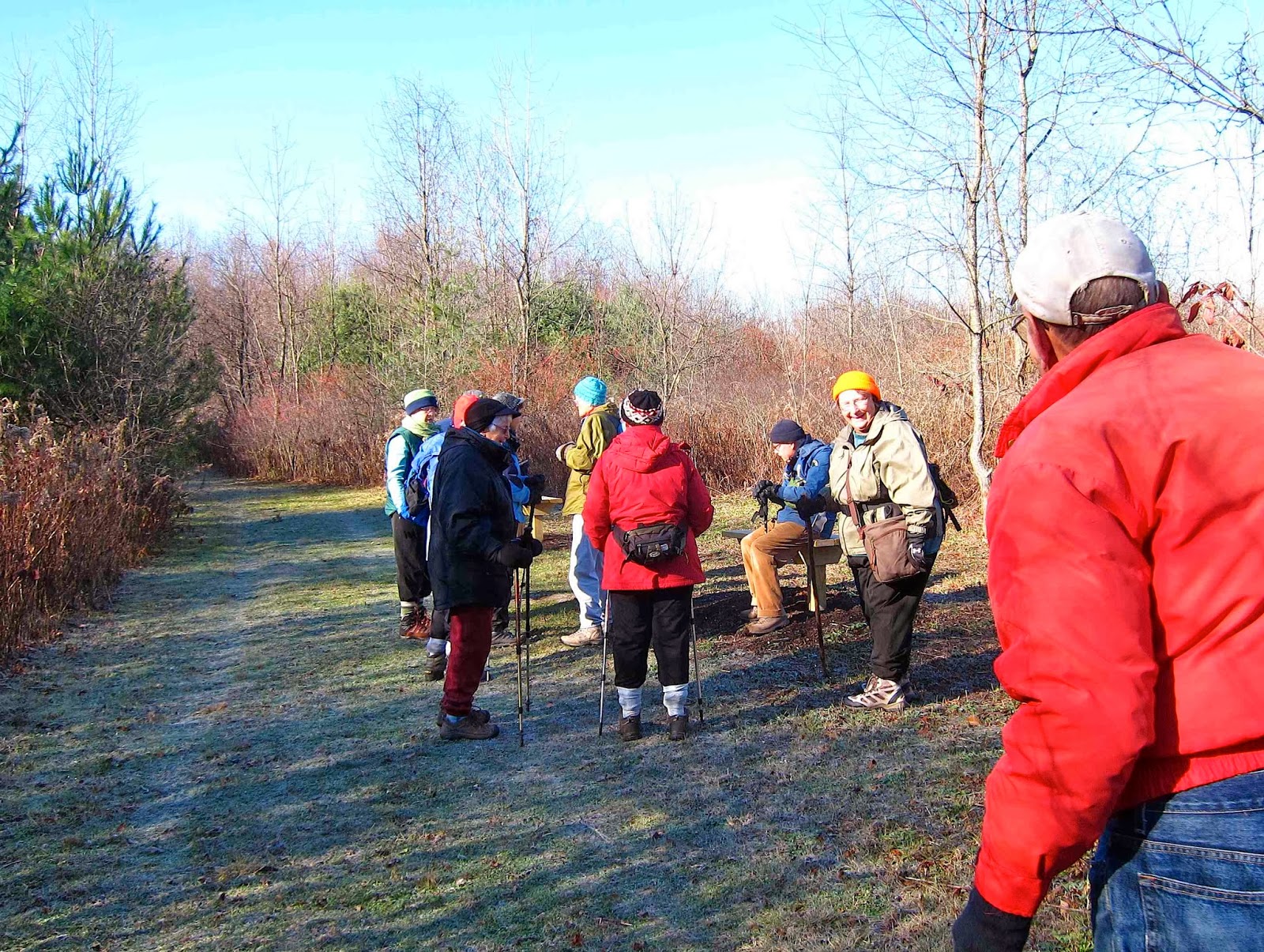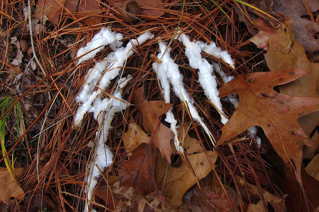 Since trees are our major focus of interest this time of year, I invited the Thursday Naturalists to come up to Moreau Lake State Park the following week to see the new tree-identification signs the park officials have installed (with the help of many volunteers) along the Nature Trail in the park. As it happened, the next Thursday (November 21) dawned bitterly cold, but that did not dissuade the hardy folks who showed up at Moreau. Such a frosty morning did, however, cause us to change our route through the park, since this turned out to be one of the rare chances many of our friends had ever had to see the phenomenon of Frostweed doing its thing. Before we hit the Nature Trail, we made a little detour to the top of Mud Pond, where we discovered that this remarkable plant (its scientific name is Crocanthemum canadense) still preserved enough moisture to create the fascinating curls of frozen vapor along its stems. We know of no other plant in our part of the country that behaves this way.