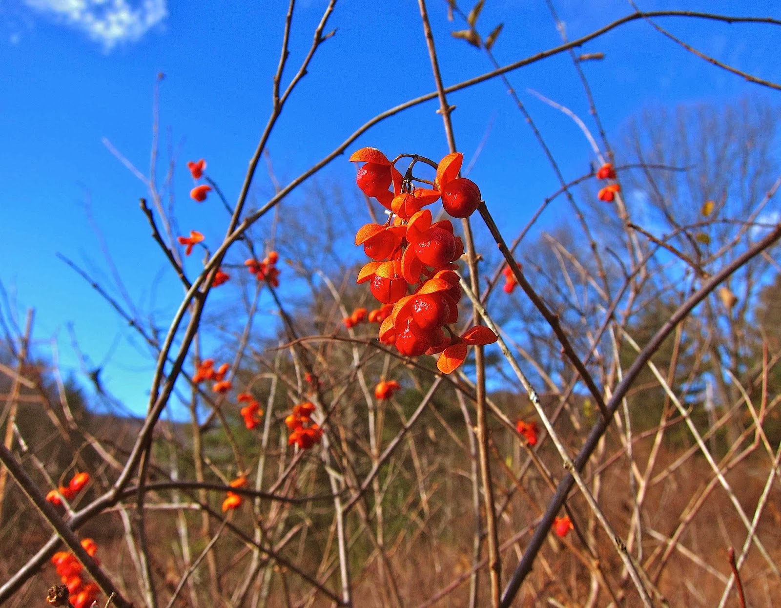 Although these berries appear very similar to those of the Asiatic Bittersweet, because they grow in a terminal cluster rather than as clusters in the leaf axils, we can be confident that they are indeed our native Climbing Bittersweet.