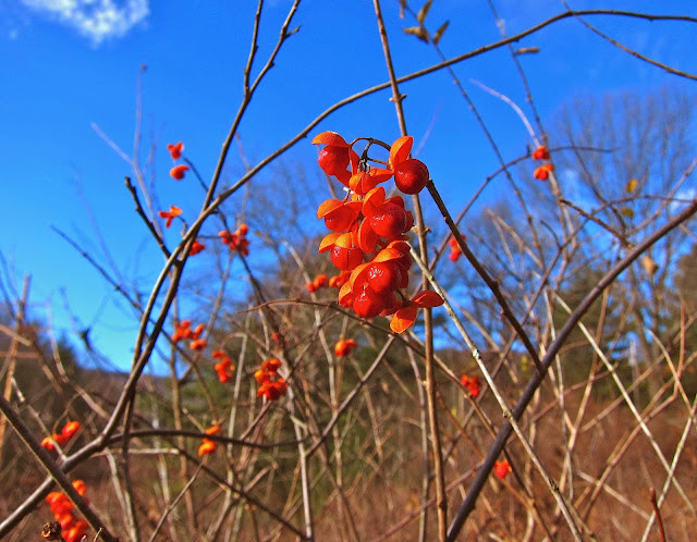 We were also lucky to spy some gorgeous clusters of Climbing Bittersweet (Celastrus scandens), its beautiful orange-husked red berries complemented by a backdrop of radiant blue sky. This is our native American species of bittersweet, which is becoming increasingly rare because of being supplanted by the extremely invasive Asiatic Bittersweet (C. orbiculatus).