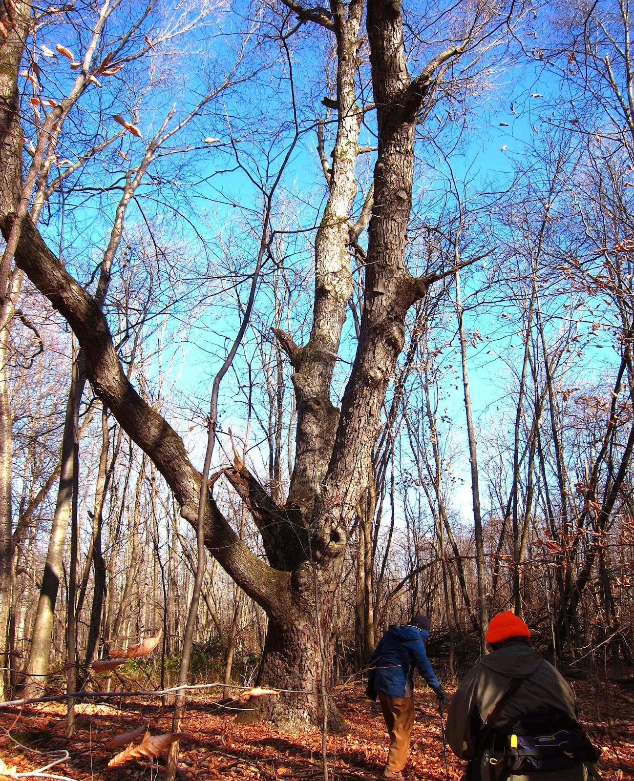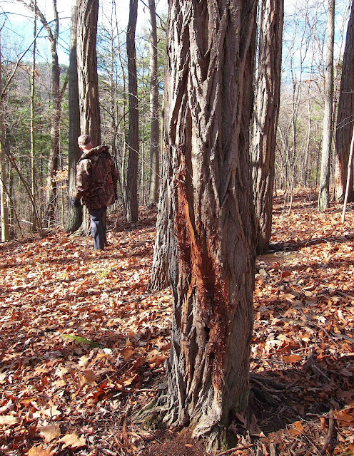 We found another puzzle among this group of Black Locust trees. On every trunk of this group of five or six locusts, we discovered the bark had been torn away on one side of the trunk from about four feet above the ground. It seems unlikely that these were caused by deer rubbing their antlers on the trunks, but what else could have caused this bark damage? I'd love to hear other guesses.