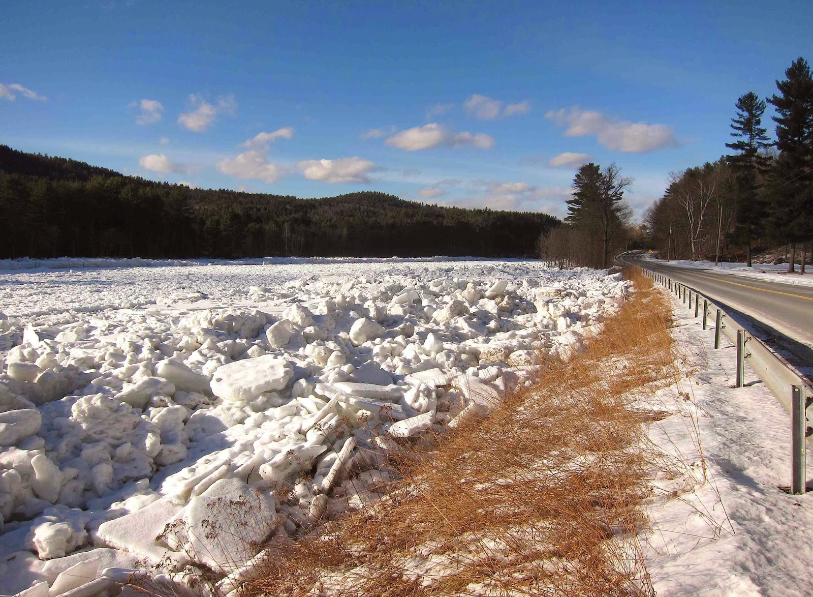 On my return home, I took the road that follows the opposite bank, stopping at a point we call Snake Rock to observe the piles of frazil towering over the side of the road. Last year, the ice completely covered the road to a height of over 12 feet, requiring several weeks of work to make the road passable once again.