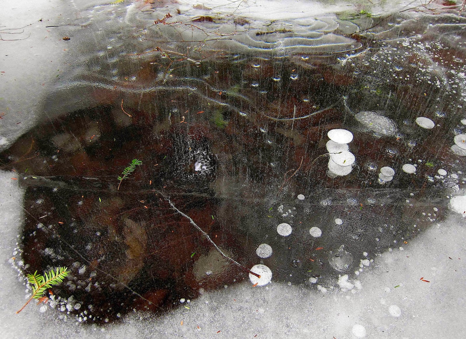 This puddle was as fascinating as it was beautiful. A solid 6 or 8 inches thick, the ice was as clear as glass and had captured not only the stacks of coin-shaped bubbles, but also vertical strings of tiny bubbles like those that form in champagne. There were also cascading ripples held within the clear ice, as lovely as the organdy ruffles on a petticoat.