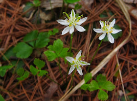 In the same damp area nearby were blooming these tiny little popcorn-ball flowers of Dwarf Ginseng (Panax trifolium).