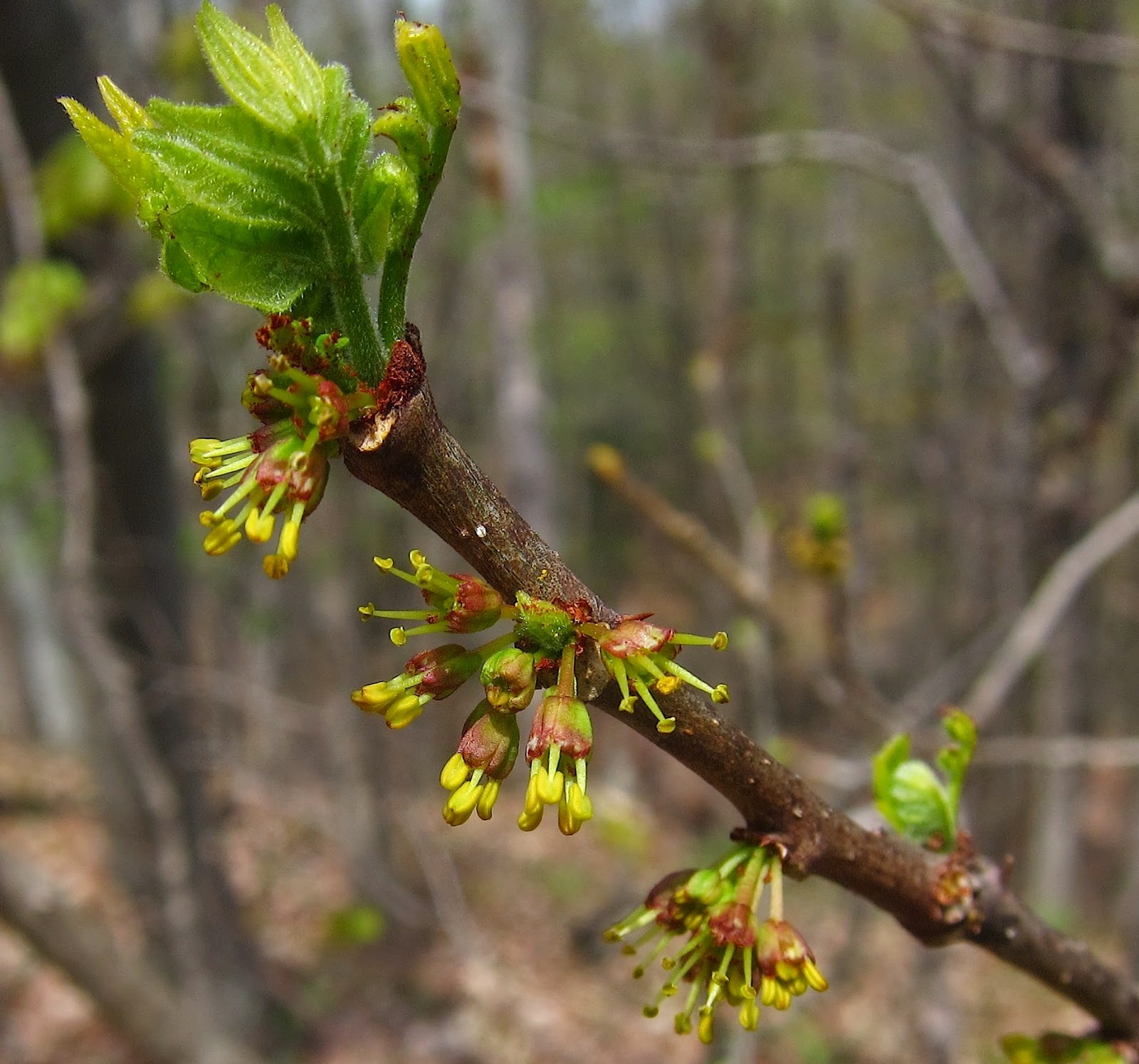 The tiny staminate flowers of Northern Prickly Ash (Zanthoxylum americanum) are certainly not as showy as those of the Shadblow, but a close look reveals that they are quite colorful.