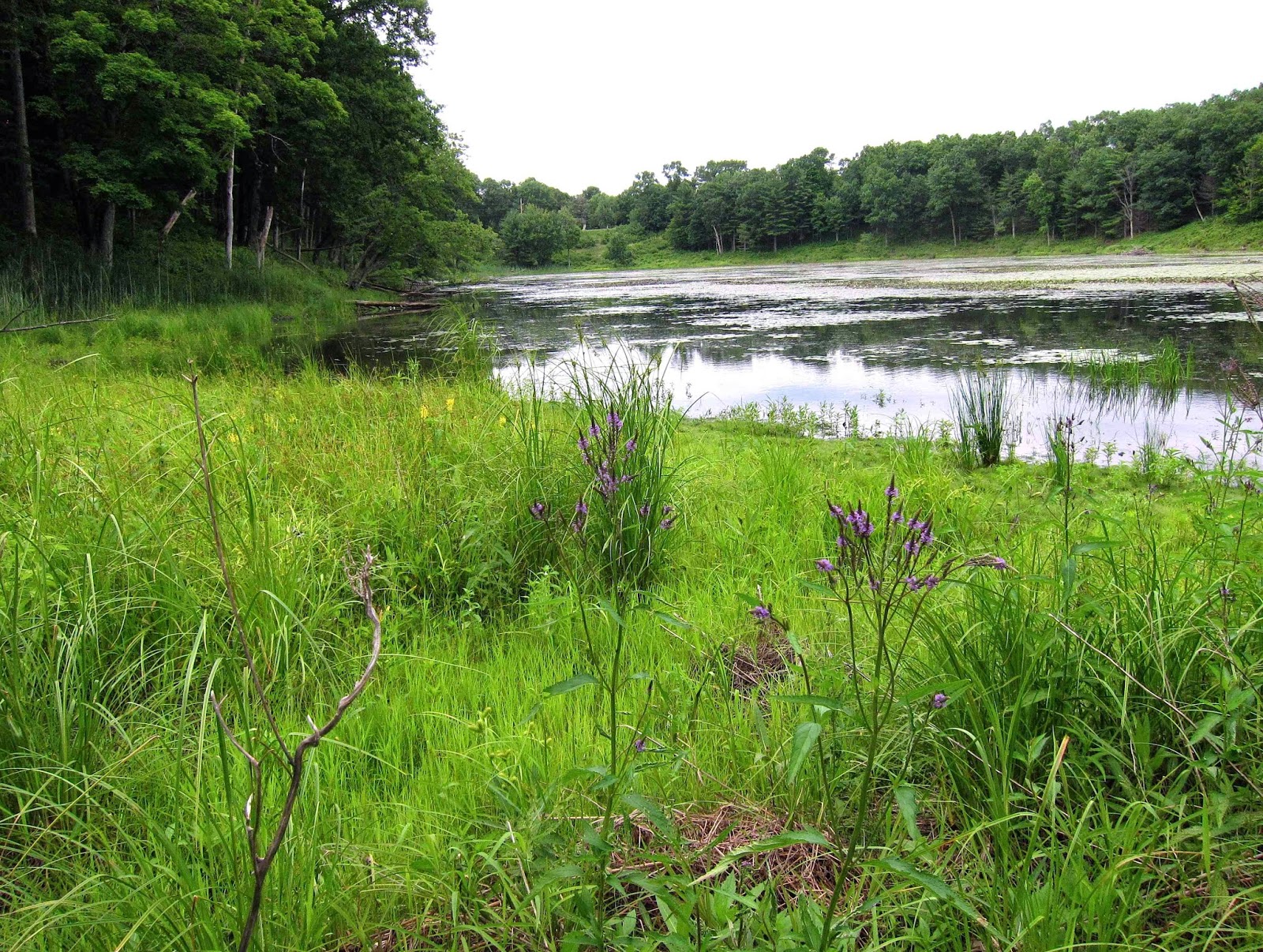 A glorious day to explore the shore of Mud Pond:  cool and cloudy, with barely a breeze to ruffle the lily pads floating on the still dark water.  My destination today was a mud flat along the far side of the pond where I expected to find a fine variety of mid-summer-blooming plants that love to have their roots wet.  In the photo above, you can see this mud flat as a thin ribbon of bright green just to the right of center on the far shore.