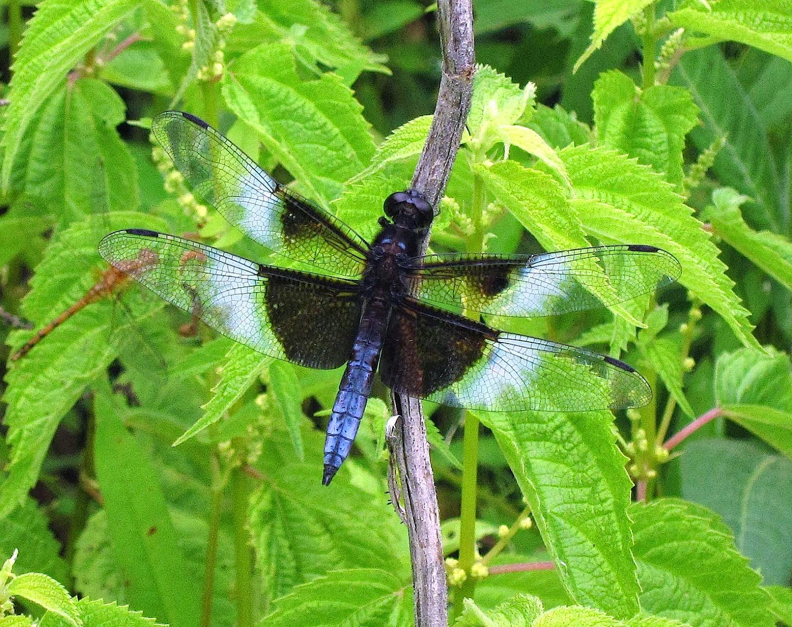 Another Skimmer, a Twelve-spotted Skimmer.  It is also a male, as we can tell from its chalky white abdomen.  Females have brown abdomens with yellow stripes down the sides, and their black-spotted wings lack the white patches the male displays.