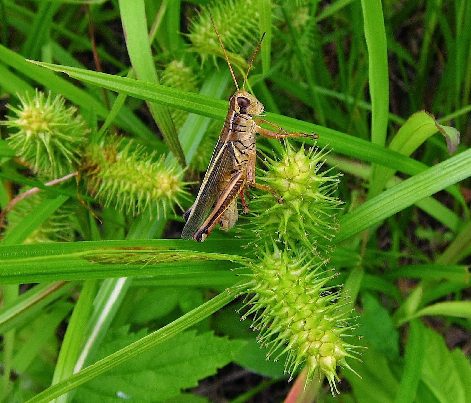 I thought this was one handsome grasshopper, looking so snazzy with his shiny brown eyes and herringbone legs.  The plump ripening fruits of a sedge set him off quite nicely, too.