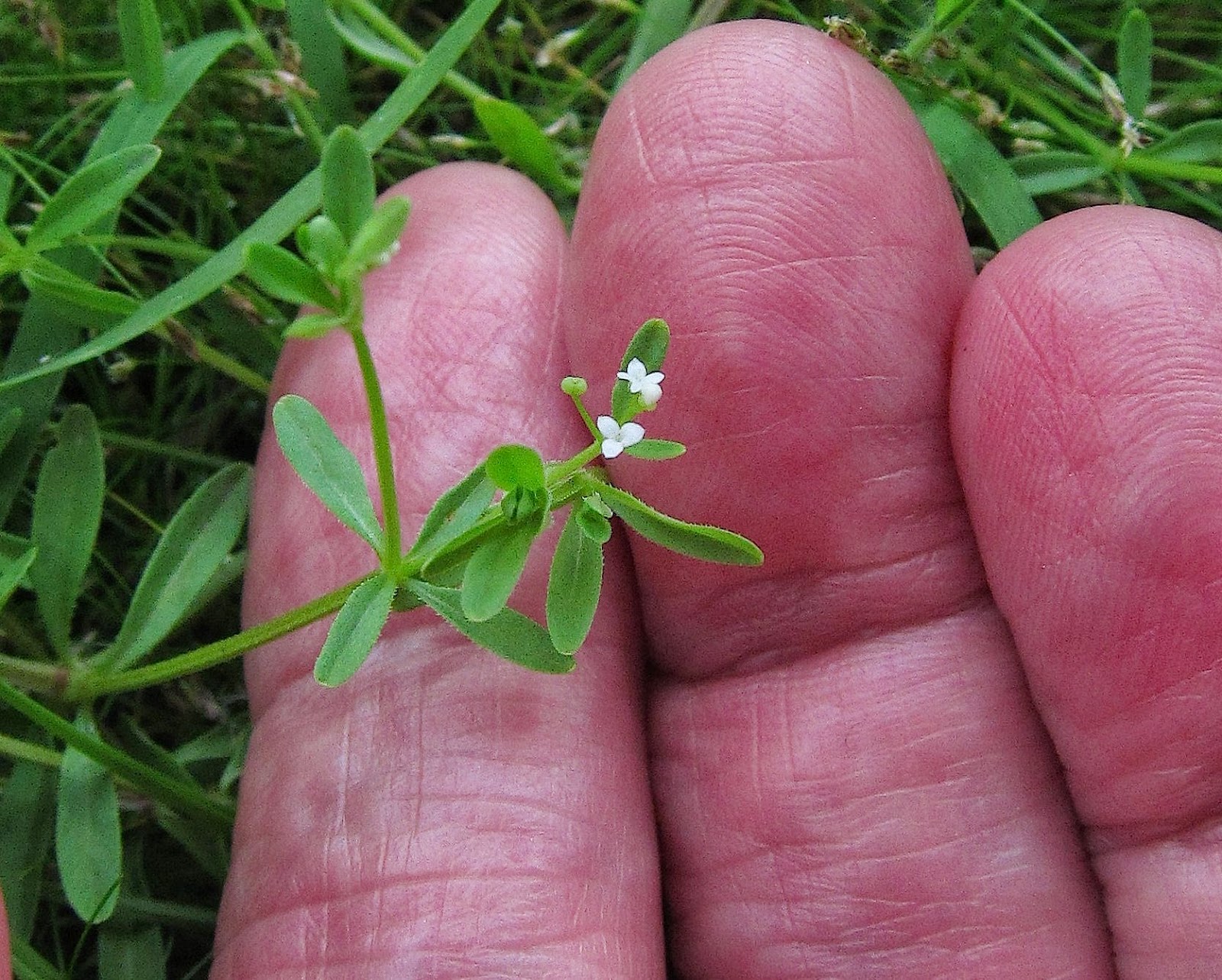 Here's another of the tiny flowers that thrive at the muddy edges of ponds.  This is Small Bedstraw (Galium trifidum), anomalous among bedstraws for having some flowers with three petals and sometimes others with four, all on the same plant.