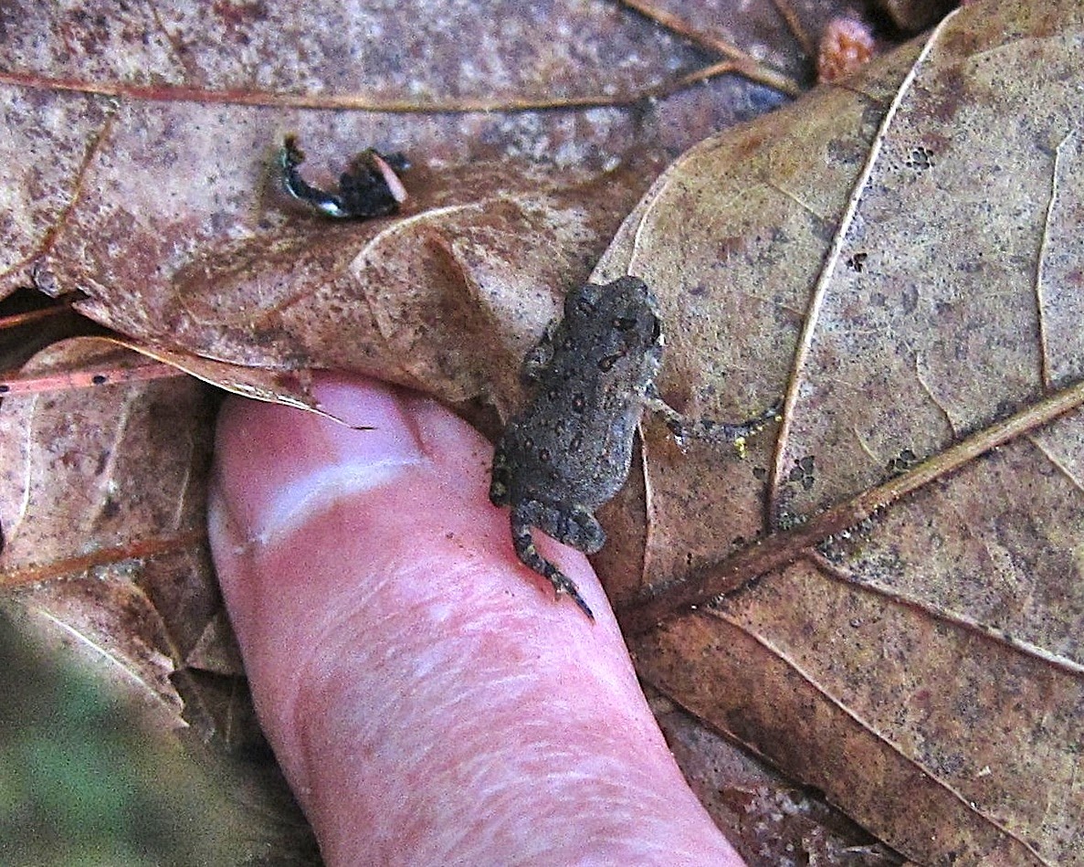 Hundreds of tiny toads were hopping all over the place today.  At first I thought they were crickets scurrying and hopping through the leaf litter, but a closer look revealed their true  (adorable!) identity.