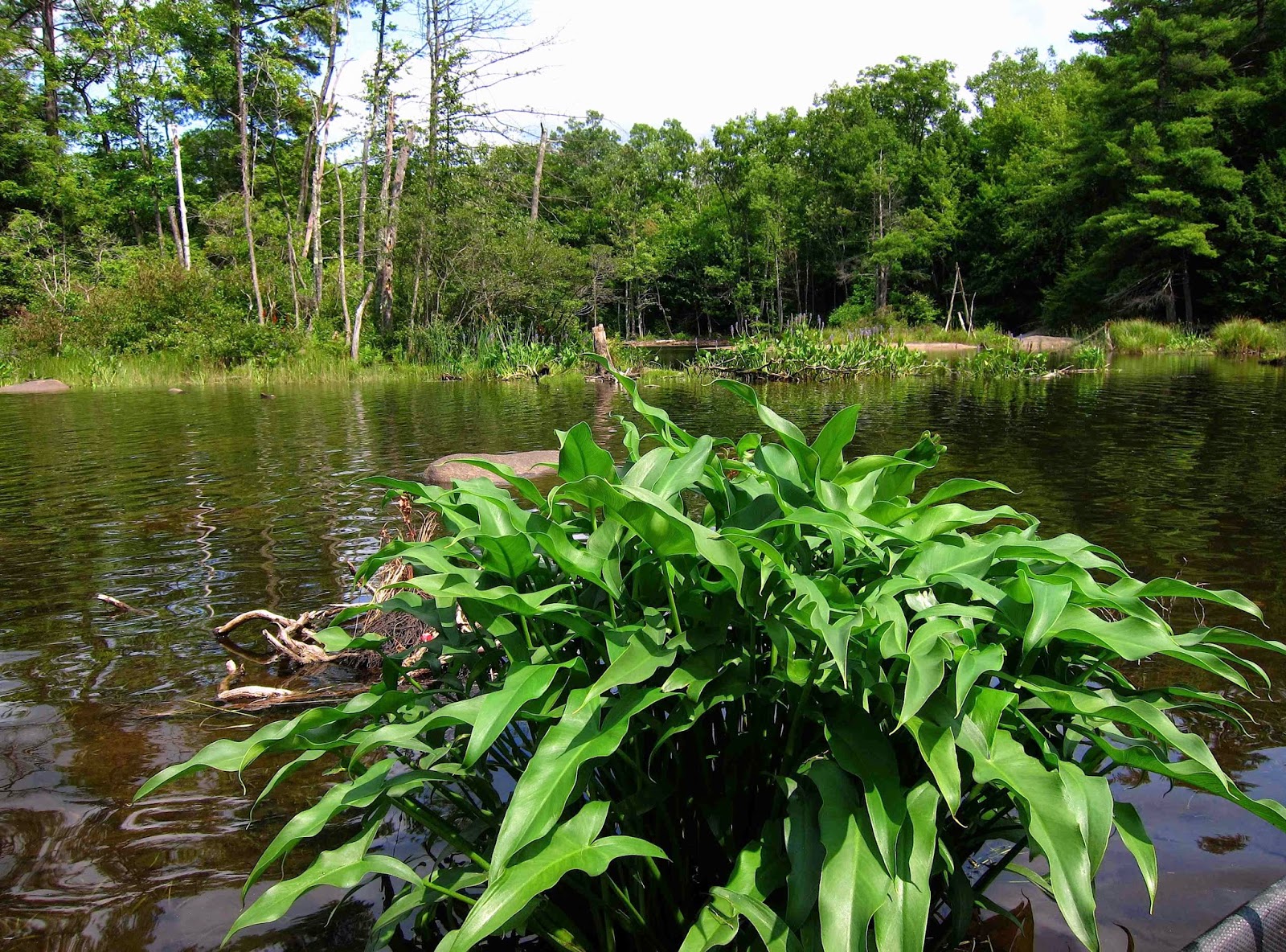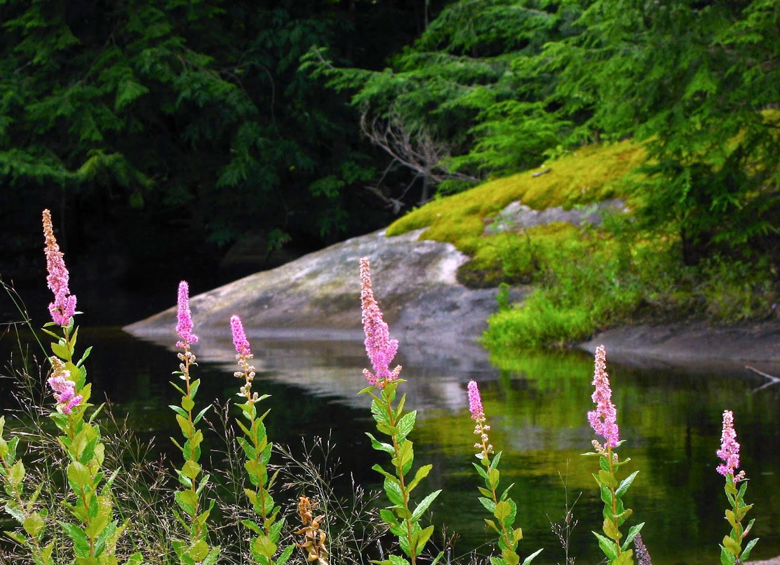 It amazes me how every year the landscape of this marshy area undergoes change, although the individual flowers remain the same. Looking through my photo files, I found a shot from four years ago that shows a parade of Steeplebush spires (Spiraea tomentosa) populating the very same rock where the Pickerelweed blooms this year. There was Steeplebush blooming in this marsh today, but not in as spectacular array as four years ago. What a lucky event that was, with the water, the light, and the flowers all caught at the perfect moment. Sometimes the beauty of this place just takes my breath away!