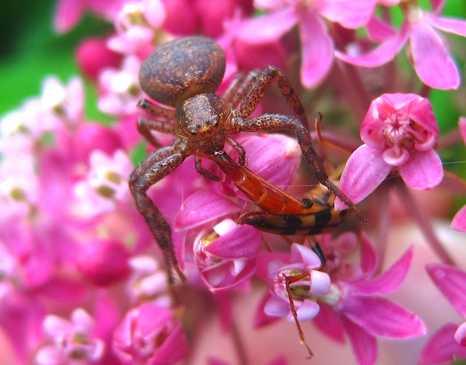 I often search among milkweed to see if any unfortunate insects might need to be freed from the florets' legtraps, but this Long-horned flower Beetle was too far gone for my help to avail. And besides, spiders need to eat, too.