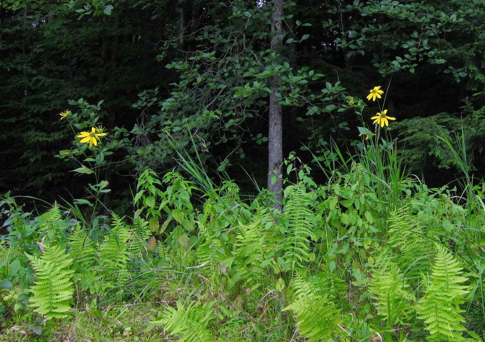 Tall stalks of Green-headed Coneflower shine out against the dark forest behind.
