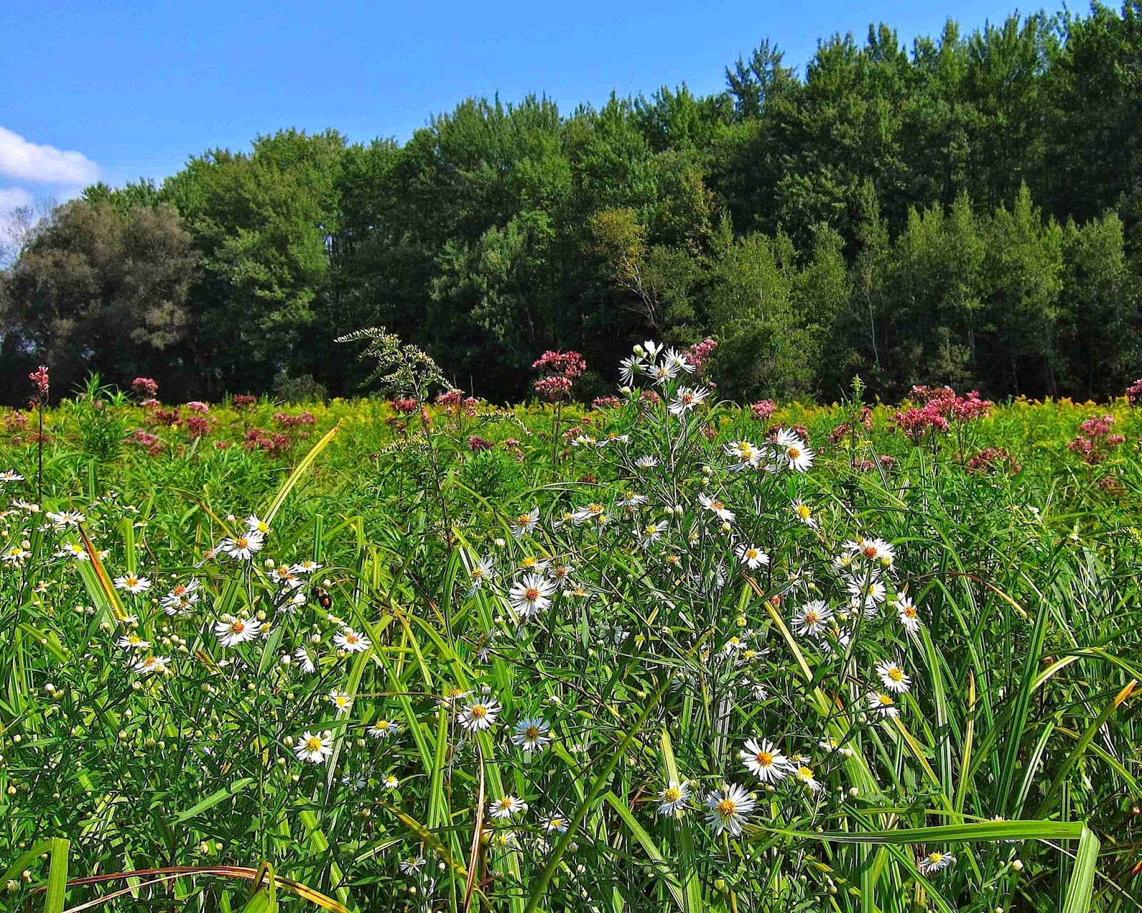 Although goldenrods and Joe-Pye Weeds constituted the preponderance of flowers that filled this meadow, we did find many asters mixed in, including the pale-lavender-flowered Panicled Aster, which we were able to identify by its narrowly lance-shaped leaves that clasp the stem.