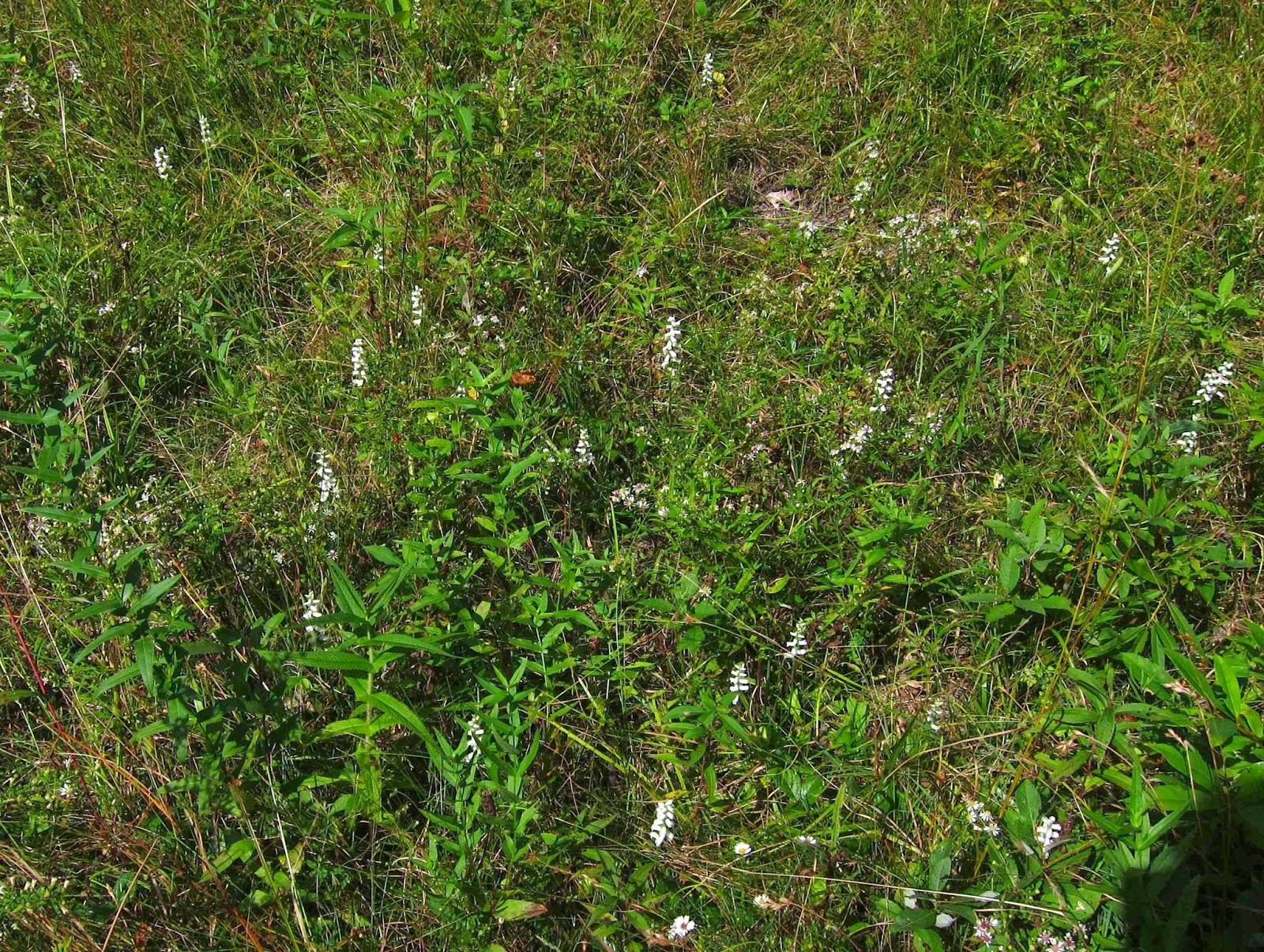 We had a second destination, too, midway along the trail to the top. Here lies a wet meadow that used to be home to dozens of Nodding Ladies' Tresses before encroaching trees began to shade them out. But just this past spring, volunteer trail workers had cleared those trees from this site, and Sue and I were delighted to find that these little white autumn-blooming orchids were back as robustly as ever.