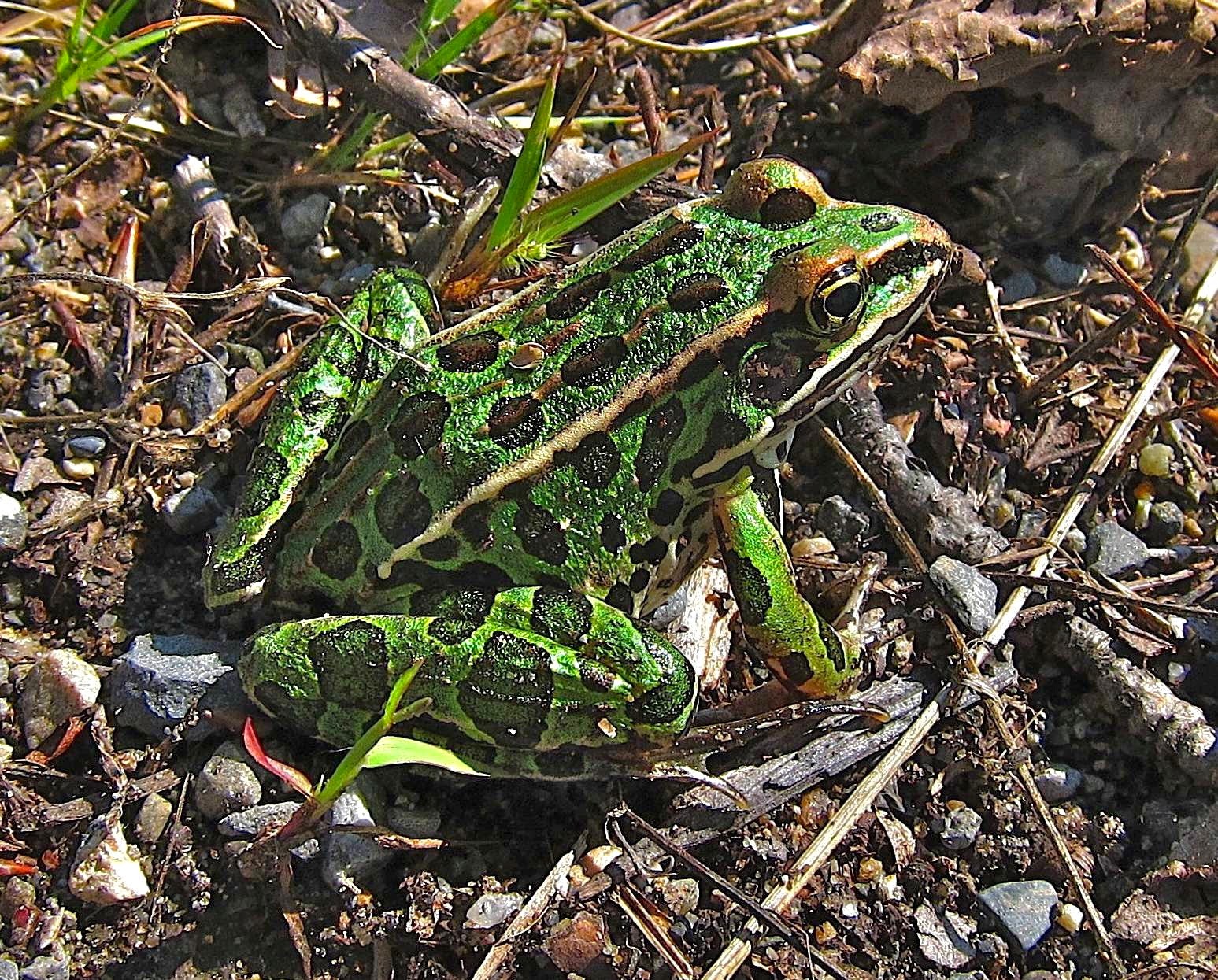 Another lovely creature we saw was this Leopard Frog, as green as green can be, and with gold-rimmed eyes.