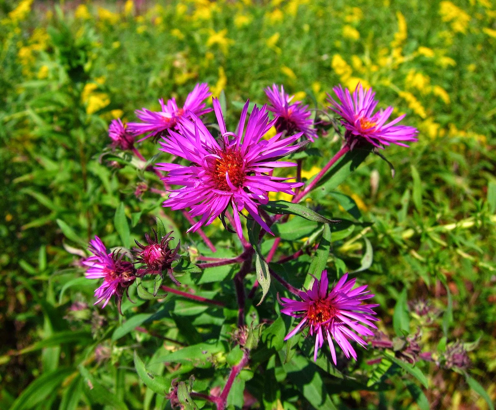 Acres of blooming goldenrods were studded with numerous clusters of pretty purple asters. After examining their leaves and the bracts of their flowerheads, I decided that this was most likely the species called Smooth Aster.