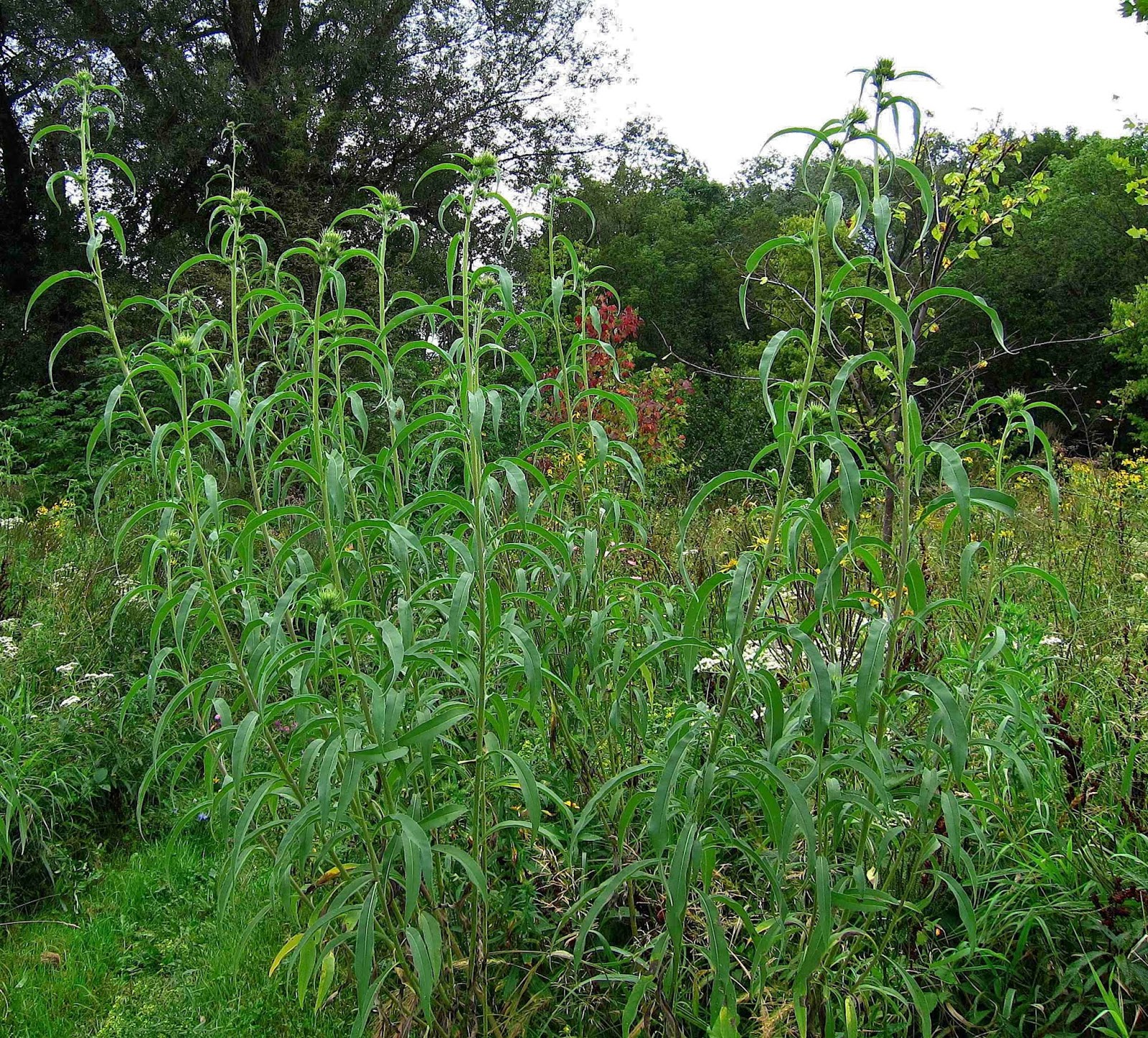 I recognized this odd plant as a species of sunflower, but I could find nothing like it, with such deeply folded toothless leaves, in any of my wildflower guides, which cover only those plants that normally occur in the northeastern United States. So I searched the internet for images of "sunflowers with sickle-like leaves" and there I found its look-alike in Maximilian's Sunflower, a native of the central plains. So how the heck did it find its way to the banks of the Kayaderosseras Creek? Most likely it arrived with the root balls of the young trees that were planted here, which could have come from nurseries across the U.S., I suppose. At any rate, it's surprises like this that keep me coming back to the banks of the Kayaderosseras at Gray's Crossing. I never know what I will find.