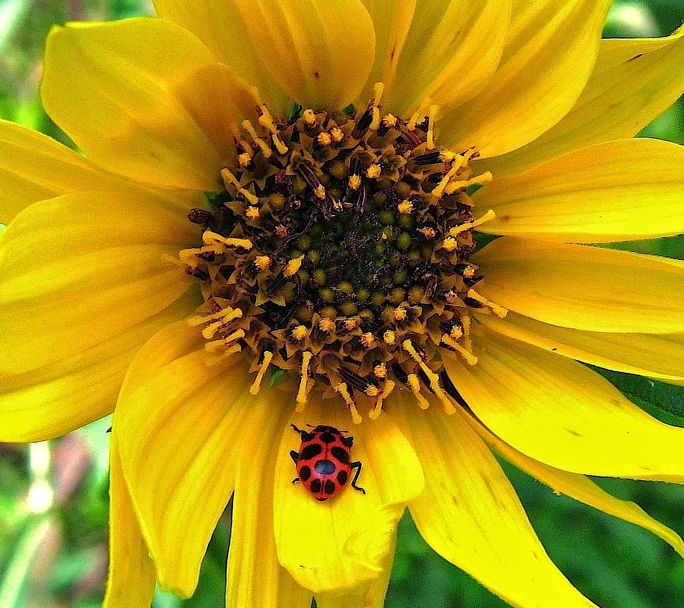Such a pretty little bug, the Twelve-spotted Lady Beetle! This Ladybug, which is native to North America, is a predator of many plant pests, but also likes to dine on pollen, a food abundantly supplied by this sunflower's disk flowers.