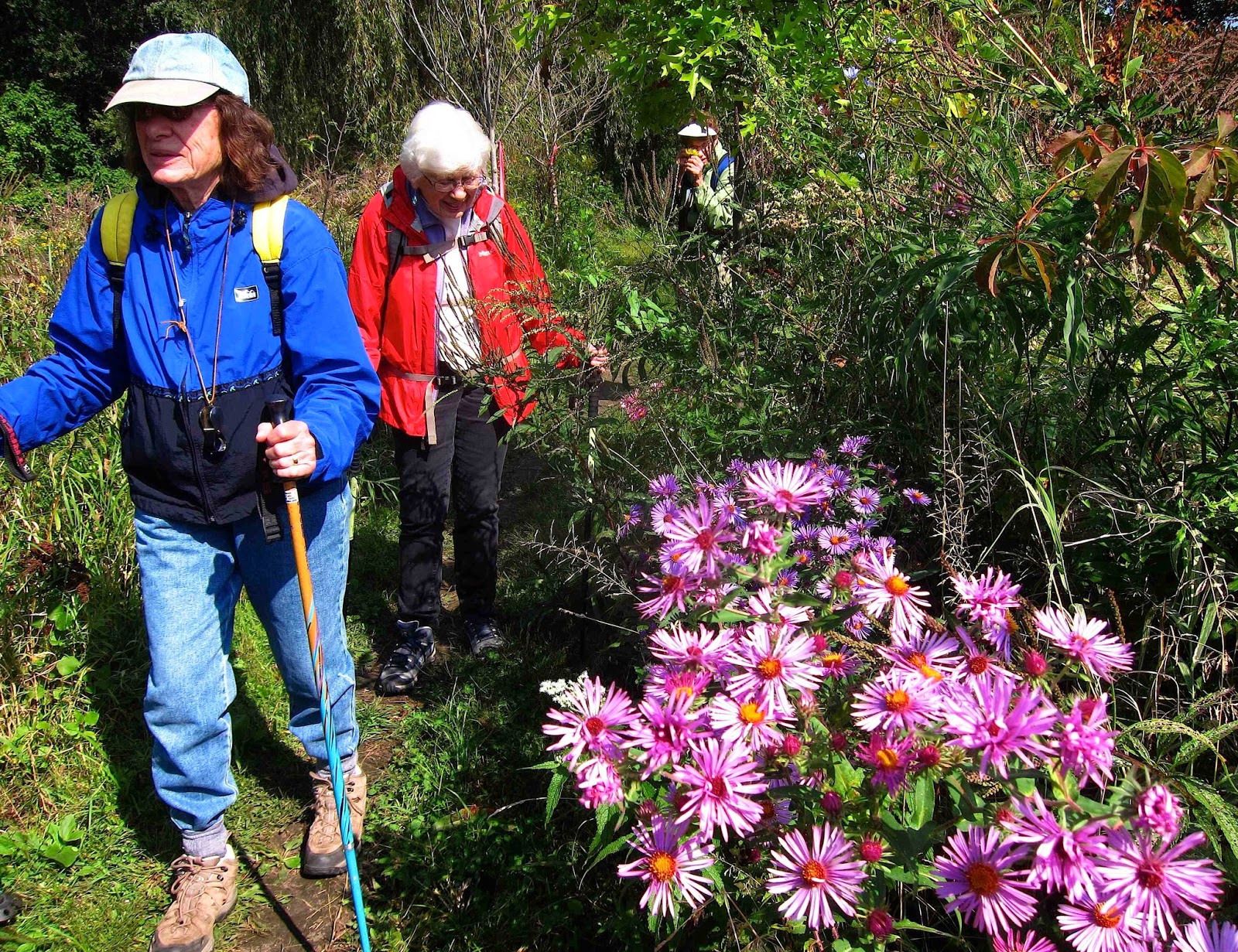 All of us have seen the deep-purple variety of New England Aster many times, but for some of us, this was the first opportunity to see this spectacular native wildflower in its rosy pink variety. What a show they put on, filling the open meadow along the banks of the creek with a brilliant mix of colors, mixed in with accents of Boneset and Joe-Pye Weed and bright-yellow sunflowers.