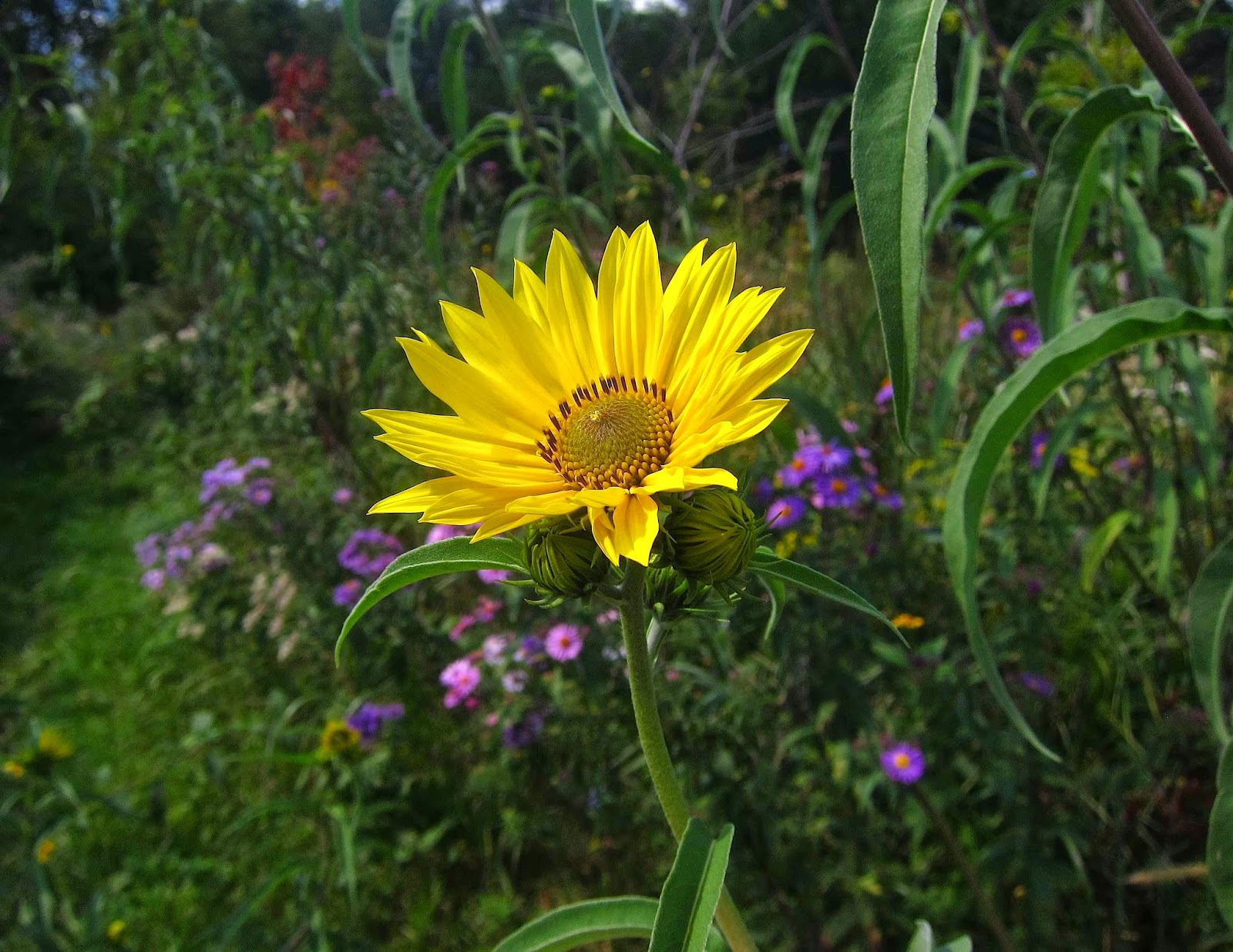 And here's what was once a muddy plain scraped bare of all vegetation, now abounding with beautiful flowers. As it happens, those towering Maximilian Sunflowers are not really native to New York State, being a prairie native most likely introduced to this site either on the rootballs of the young trees or on the tires of the excavation equipment. They were not here three years ago, and now they are becoming abundant. It will be interesting to see if they persist.