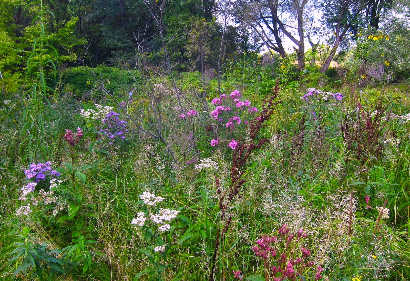 Well, it did. I shouldn't have worried. Many native species of trees and shrubs were planted, and in less than a year (when I took the photo below in September, 2013), the banks were completely covered again, and with mostly native wildflowers like goldenrods, asters, sunflowers, Evening Primrose, Wild Bergamot, and Blue Vervain. Unfortunately, some invasive species like Mugwort were introduced along with the dirt surrounding the new trees' rootballs, but so far they don't seem to have monopolized the site.