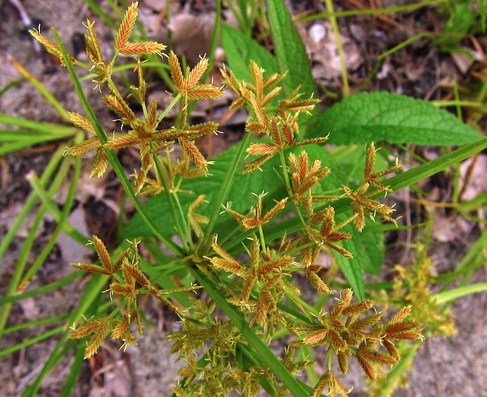 There were asters, too, of several species, white ones and others tinged with violet, but this little sedge outshone them all for beauty, with its golden color and dainty herringbone pattern. My friend Andrew Gibson has suggested that this pretty sedge is Cyperus dentatus, also known as Toothed Flatsedge.