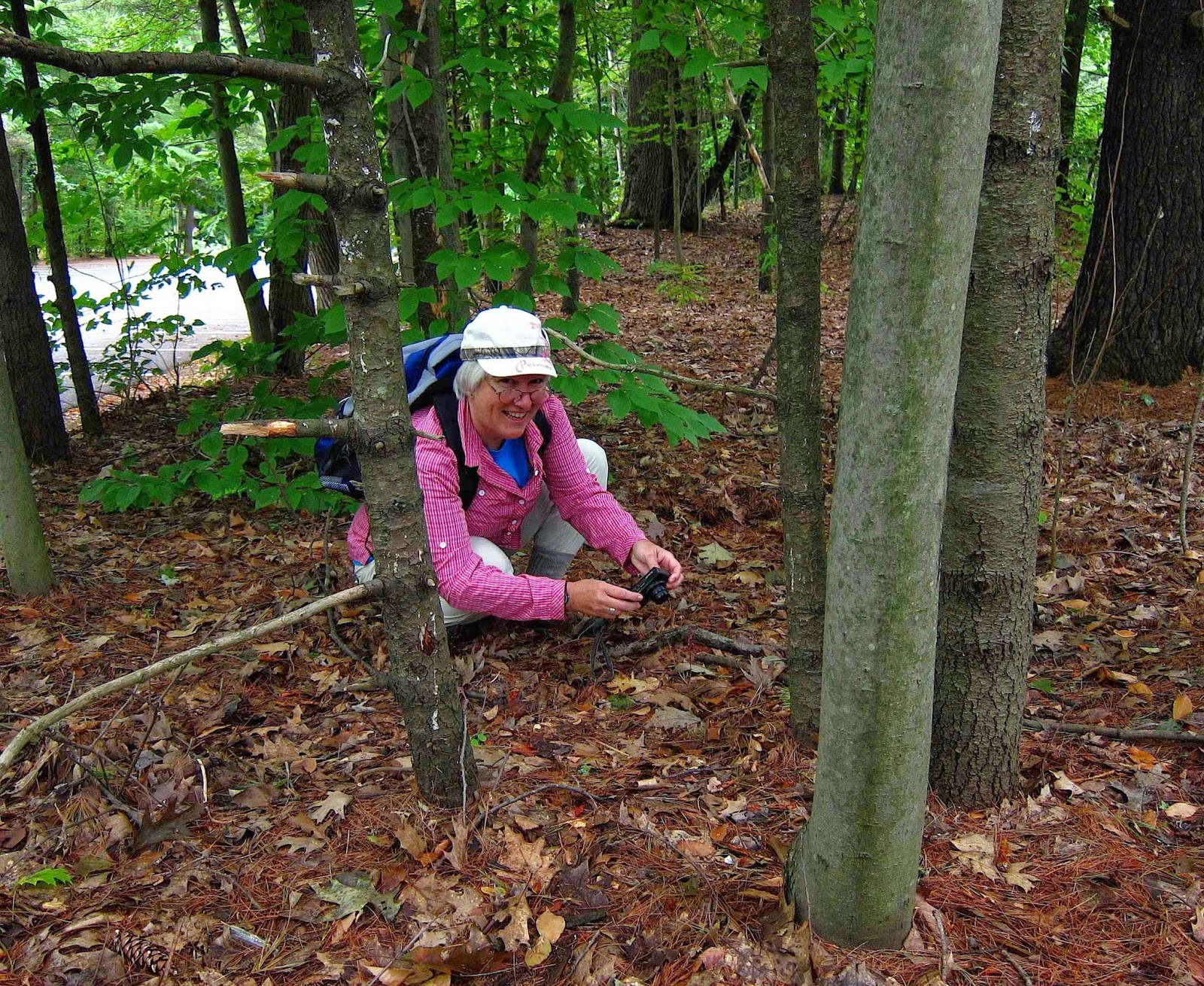 Aside from just enjoying the sheer beauty of the Red Oak Ridge Trail, Sue and I had chosen to hike it now because we hoped to find the tiny late-season orchid called Autumn Coralroot. As it turned out, we did find a few rather faded specimens along the ridge, but our big surprise was finding a huge patch of Autumn Coralroot right by the parking lot, even before we had started up the trail. I doubt very much you can see the flower that Sue is photographing here, since this little orchid is just about exactly the color and texture of fallen leaves. But Sue managed to see them, and when we counted them, we found at least three dozen right here beneath these trees.
