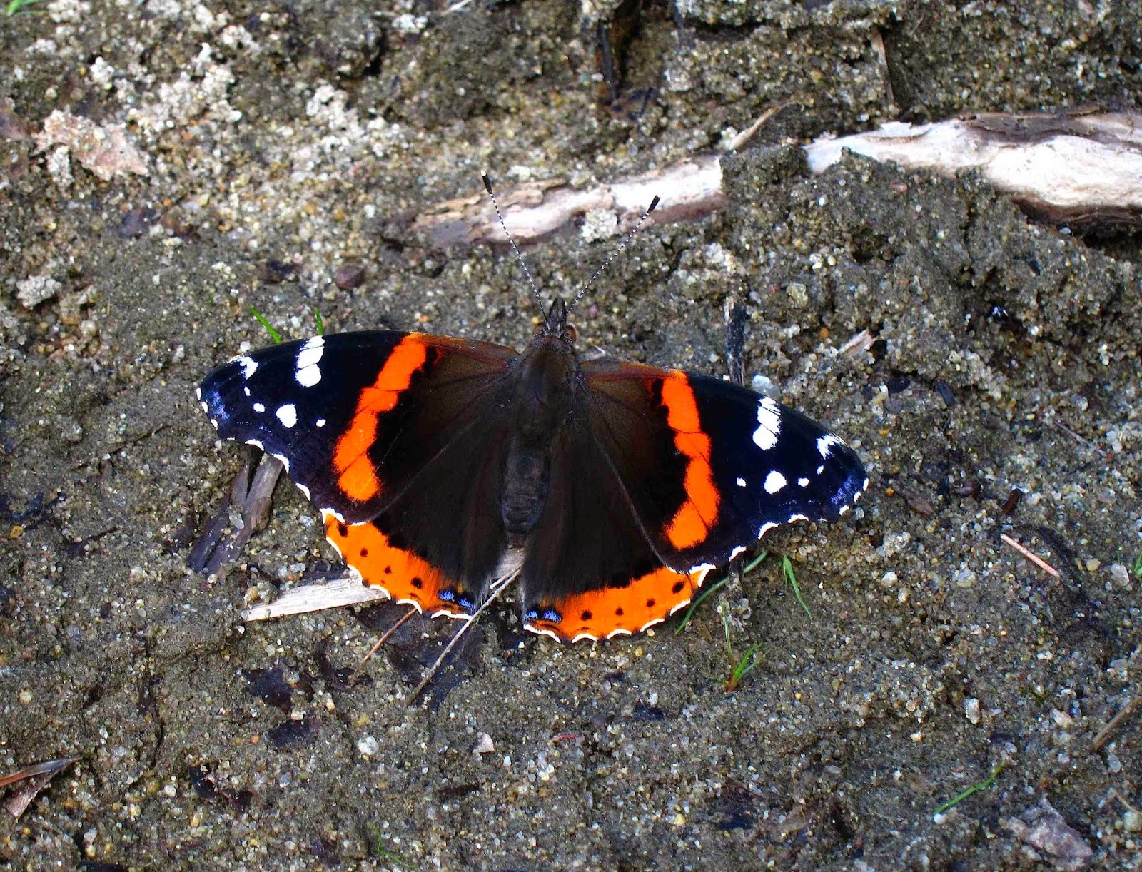 This Red Admiral Butterfly must also have felt it could safely graze, since it was so busy sipping from a patch of onshore mud I could creep very close and take a photo that captured every beautiful spot of color on its outspread wings.