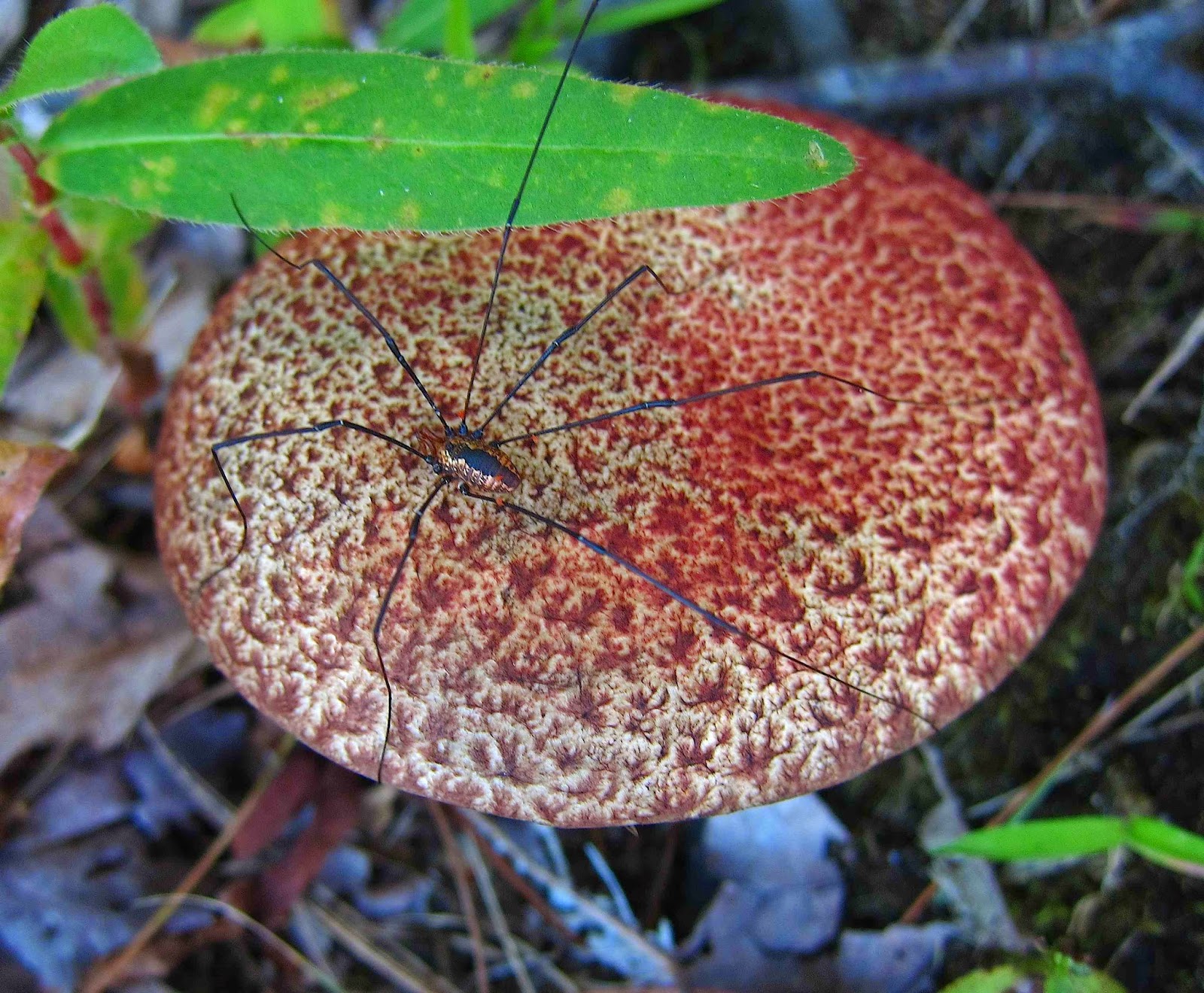 Nearby, I found one of the prettiest of the fall mushrooms, the Painted Bolete (Suillus spraguei), which a Daddy Longlegs had found to be a pleasant resting place. (Those are tiny red mites on the Daddy, not shreds of red from the mushroom.)