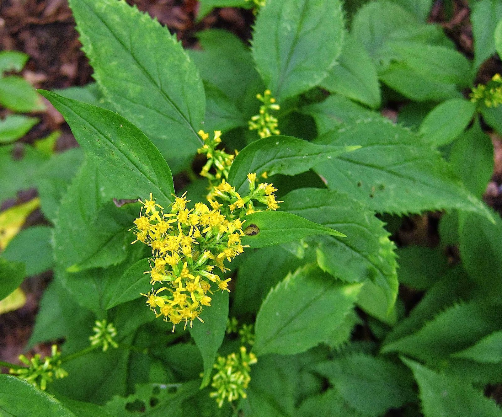 Zigzag Goldenrod (Solidago flexicaulis) is one of the rare goldenrods that blooms in deep woods, adding its bright dash of yellow to the dim light under the still-leafy trees.
