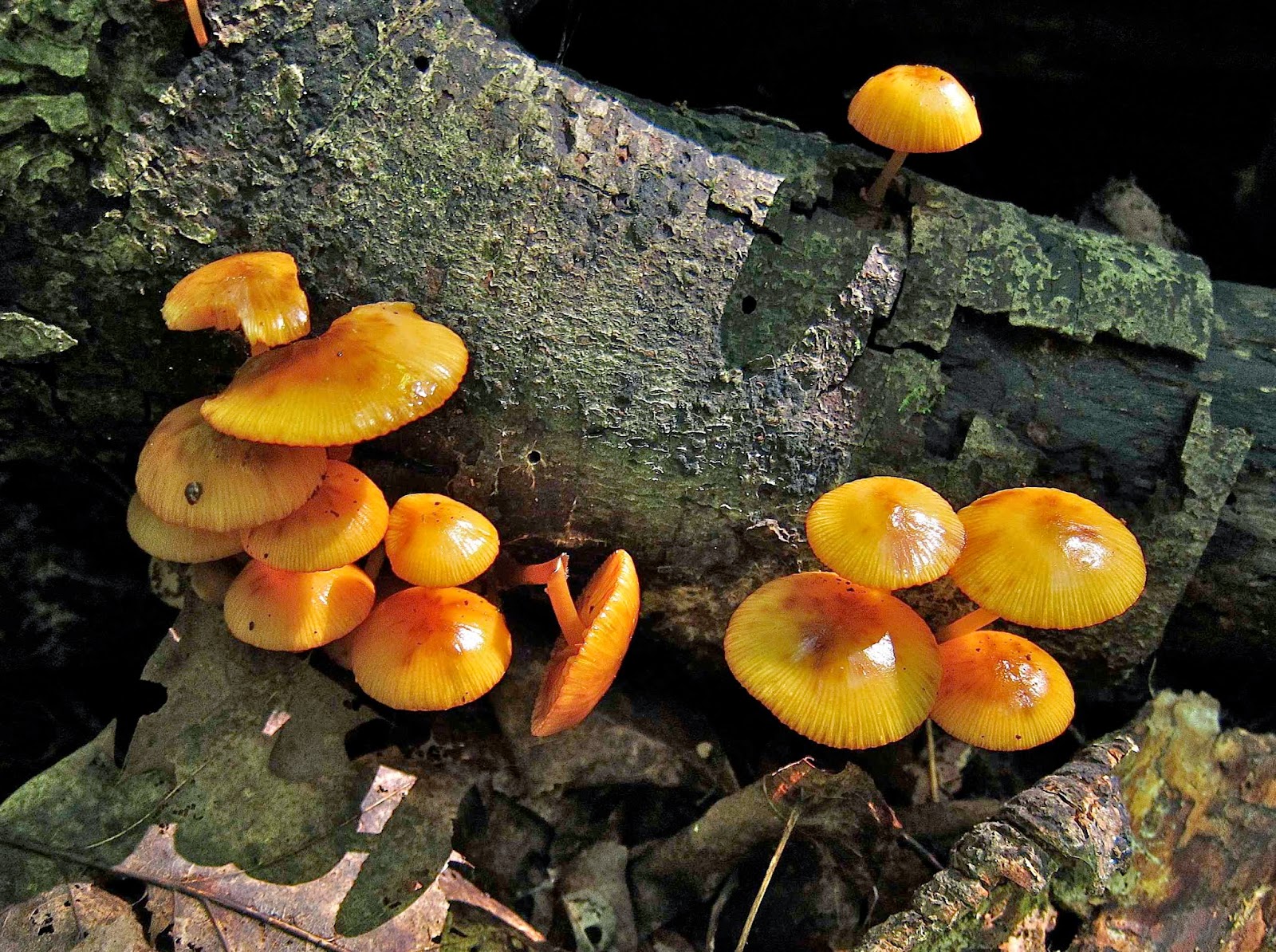 Mushrooms, too, now add their flashes of color to the woods. One of the brightest of them all is the orange-gilled Mycena leaiana, which often grows in thick clusters on rotting logs.