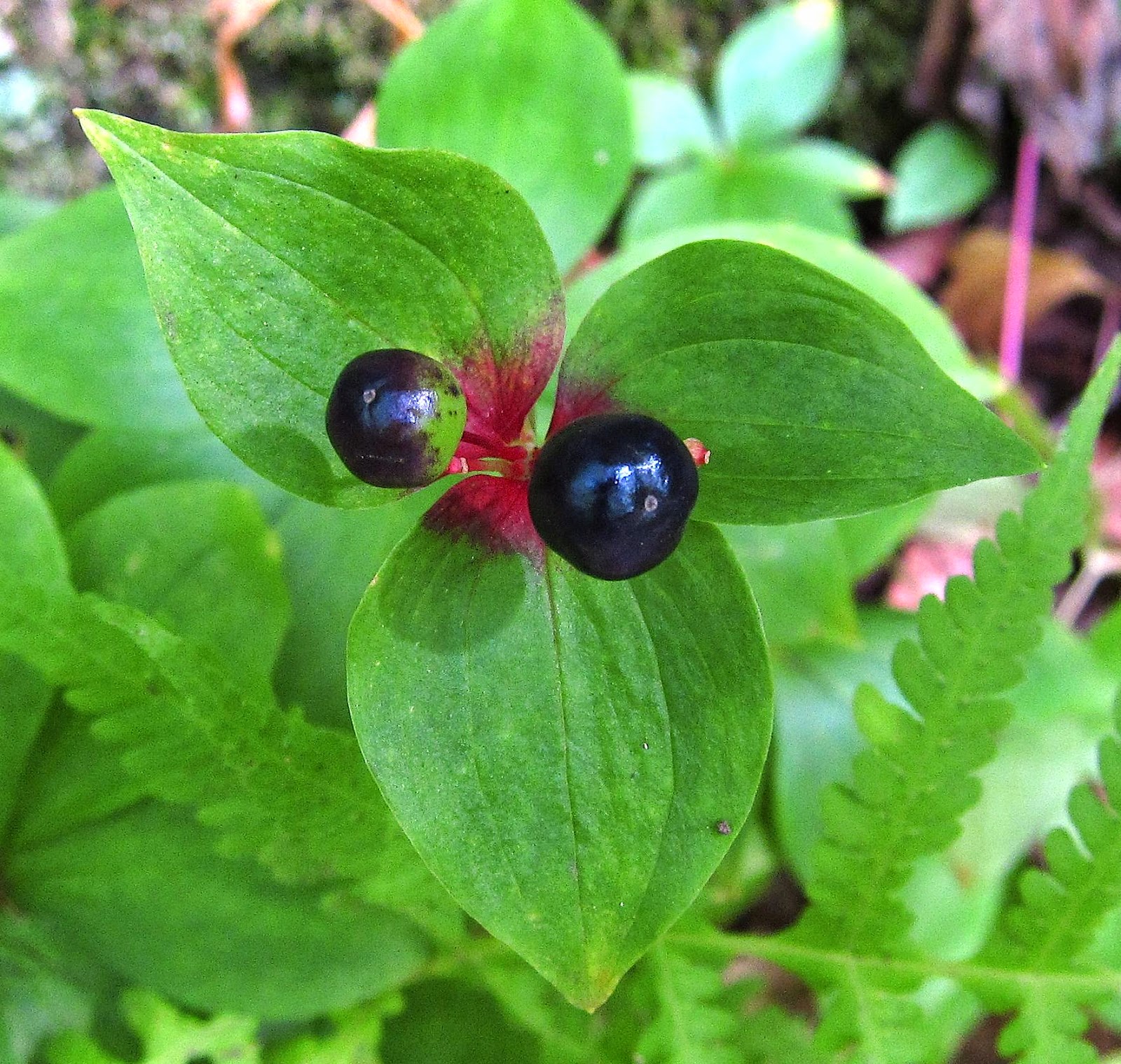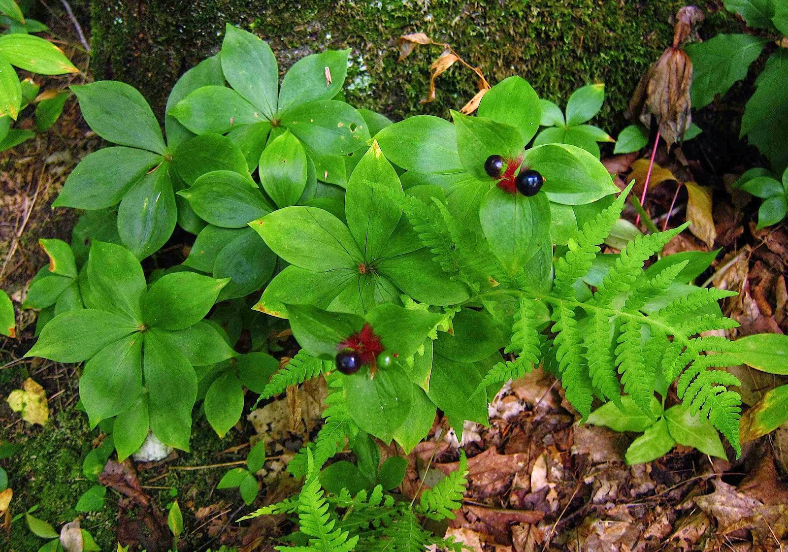 As at Skidmore, I didn't find many flowers blooming at Orra Phelps, but I was delighted to find these beautiful blue-black fruits crowning the top red-blushing leaves of Indian Cucumber Root.