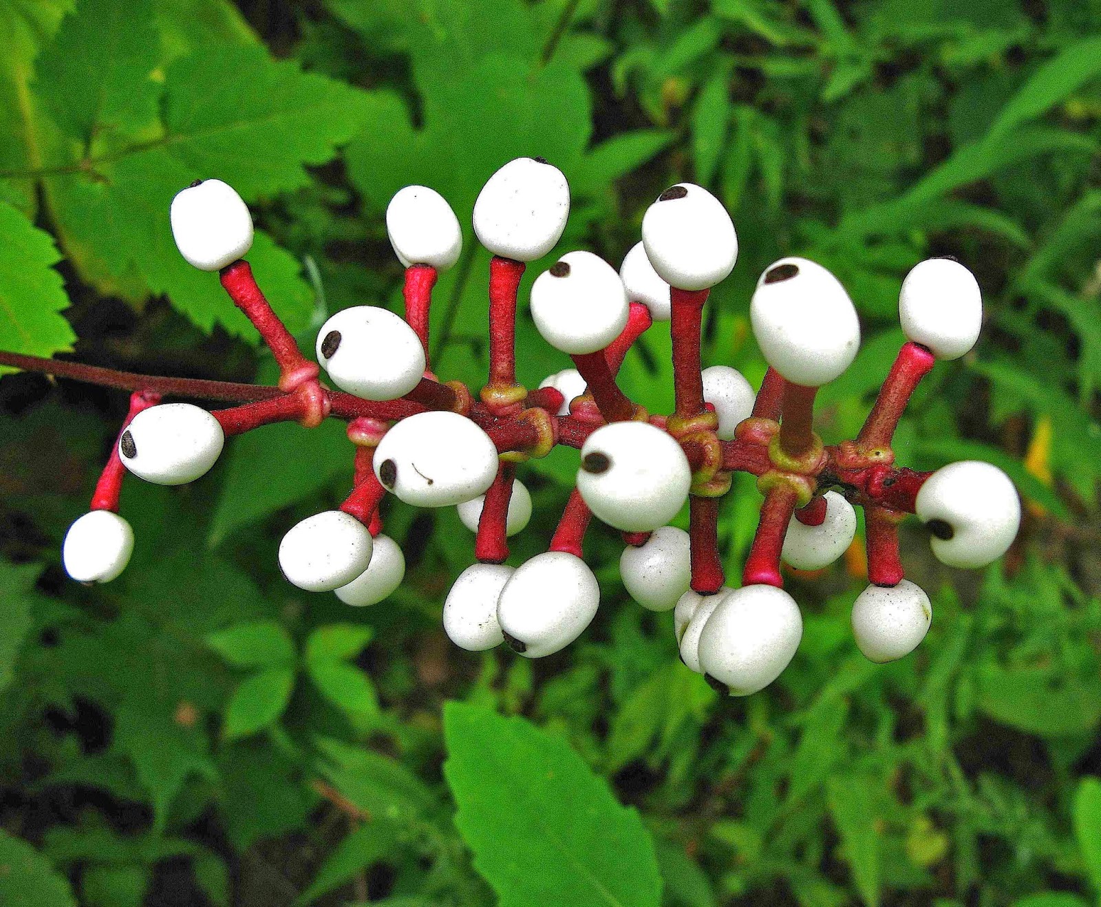 White Baneberry (Actaea pachypoda) has fruits that resemble doll's eyes, hence the source of one of this plant's other common names. The fruit-cluster's hot-pink pedicels present quite a contrast to the stark-white berries.
