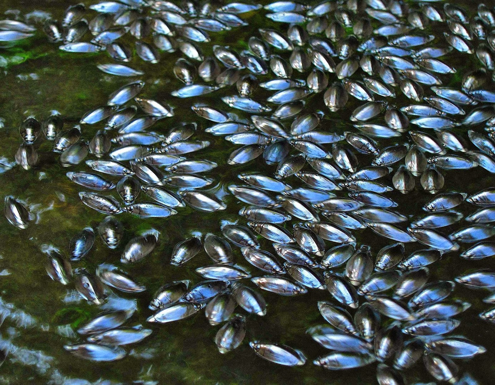 Here's a closer look at a swarm of those beetles. I witnessed this phenomenon a couple of weeks ago when I last paddled here in this same backwater, and I was surprised to see them clustered so tightly together still. I thought then that they might have been a recent hatch that had yet to dissipate, but here they all were still, packed together as tightly as ever. Unless, of course, this might be a second hatch. Very strange! But I know very little about these bugs, which I usually see swimming in circles on the surface of the water, not packed in a swarm like this. One thing I did learn about Whirligig Beetles is that they have two pairs of eyes, one pair to see below the surface, and the other pair to see what's above the water. Isn't Nature amazing?
