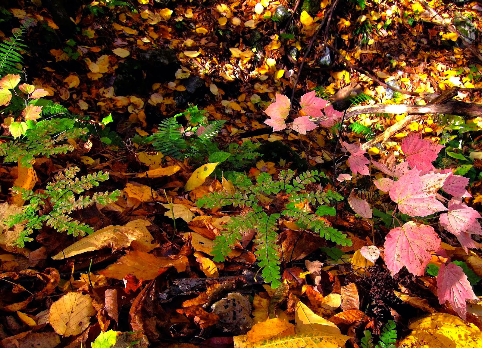 Another indicator of a limey soil was the abundance of Maidenhair Fern, still holding on to its delicate lacy green leaves, which will shrivel and disappear after frost. (The pink leaves here are those of Maple-leaved Viburnum.)