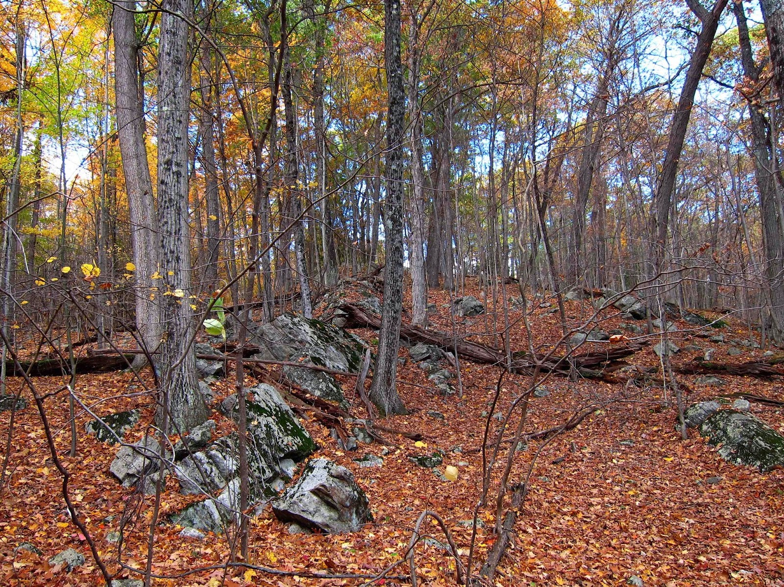 Sure, there are some Red Oaks along this ridge, some White Oaks and Chestnut Oaks, too, but this time of year it's the yellow-leaved trees like Sugar Maple and Shagbark Hickory that cast a golden glow throughout these woods, even when most of those leaves lie scattered across the forest floor.