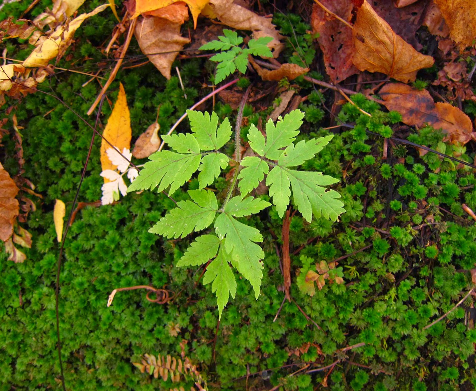 We also found patches of the lime-loving moss, Rhodobryum roseum, covering the surface of some rocks. This aptly named Rose Moss looks like a carpet of tiny flowers. Sharing its patch in this photo is another lime-loving plant, Sweet Cicely, which will bear tiny white flowers in the spring.