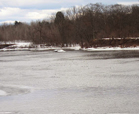 Sue spotted at least one Bald Eagle soaring over the treeline, as well as a pair of Common Mergansers disappearing downstream before I could notice them. And then she pointed out a big bunch of ducks milling about upstream. Although they were just black specks on the water to me, Sue immediately identified them as a flock of Goldeneyes. And so they were, my binoculars confirmed. The males were doing their "Look at Me!" thing, throwing their heads way back and then sharply forward, and we could hear them "peenting" at the same time. I didn't know a Goldeneye could sound like a Nighthawk! I do know they kind of whistle when they fly.
