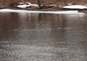 The zoom on my little camera is woefully inadequate for capturing distant creatures, but at least you can see the broad white sides of these Goldeneyes, even if you can't see the white cheek spot or anything like a golden eye.