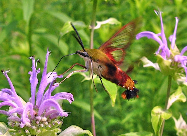 Hummingbird Clearwing (Hemaris thisbe) sipping nectar from Wild Bergamot