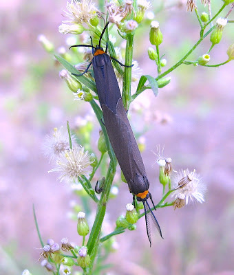 Okay, these moths may NOT be the same. I originally thought they were all three the Yellow-collared Scape Moth (Cisseps fulvicollus) ), but the blue abdomen of the first moth indicates it is more likely a Virginia Ctenucha Moth (Ctenucha virginica). Since I can't see the abdomens of the mating pair, they may well be Yellow-collared Scapes. Any help on this subject is most welcome.