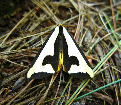 8.  I think this moth is mistakenly named, since its "collar" is orange and not yellow.  But see how blue its abdomen is beneath those chocolate-brown wings.