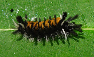 White-marked Tussock Moth caterpillar (Orgyia leucostigma). Another one with venomous hairs. But wow, what a beauty, especially arrayed on a yellow-edged oak leaf that serves as a foil for its brilliant colors.