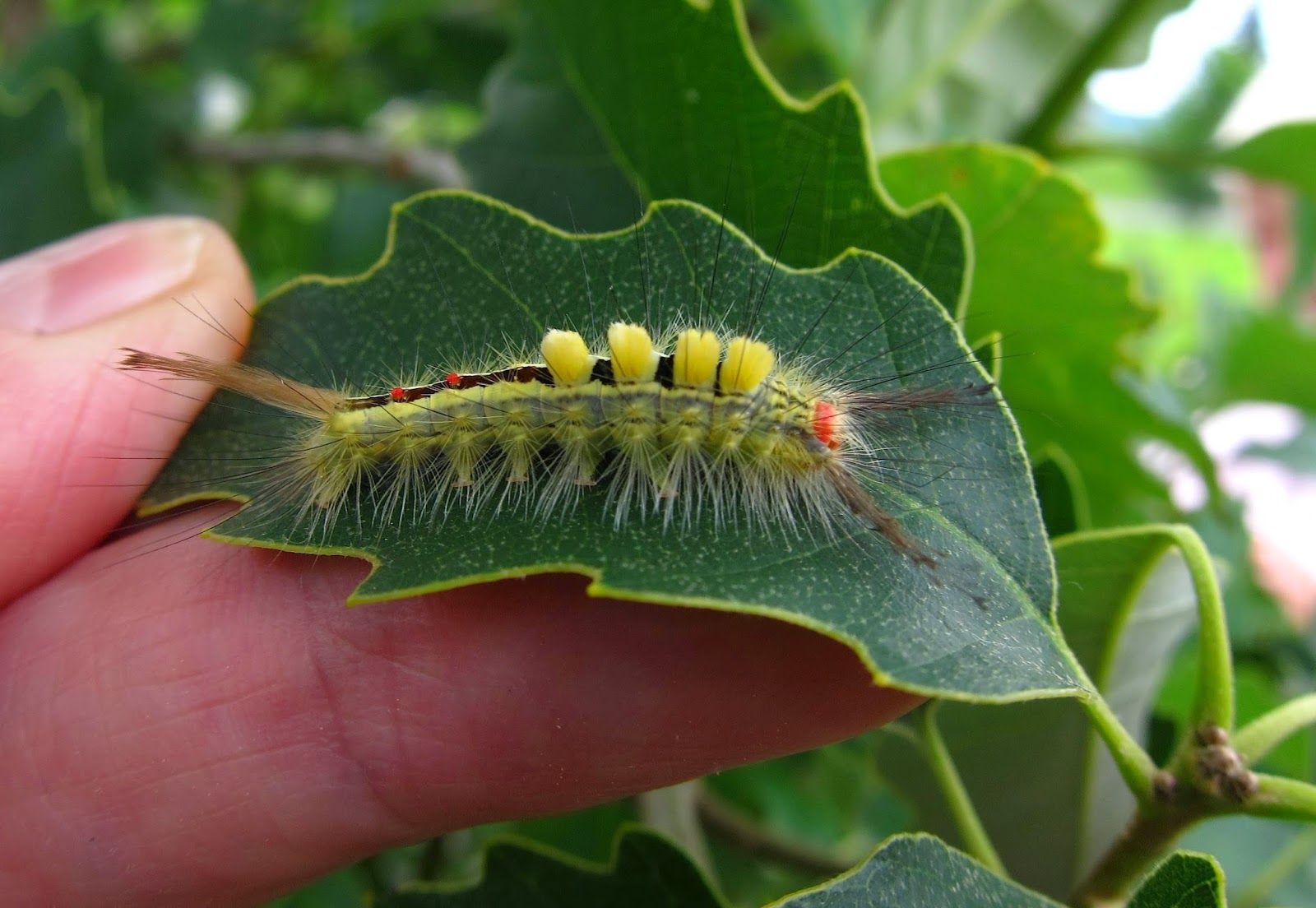 White-marked Tussock Moth caterpillar (Orgyia leucostigma).  Another one with venomous hairs.  But wow, what a beauty, especially arrayed on a yellow-edged oak leaf that serves as a foil for its brilliant colors.