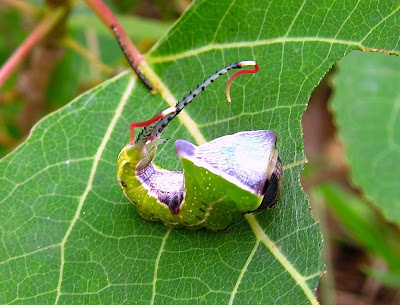 This Black-etched Prominent Moth caterpillar (Cerura scitiscripta) was just quietly moseying along until I poked my camera too close to it. That's when it reared up and puffed up its fat front end, and out of those long prongs on its rear shot bright red tendrils, which it whipped about in a frenzy. It was quite something to see! The adult moth is more subtly colored, furry and white, etched with black markings.
