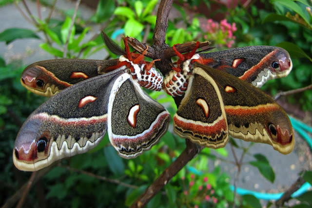 Cecropia (Hyalaphora cecropia), the day after she emerged from the cocoon. She has already been found by her mate and will live only a few days after mating and laying her eggs.