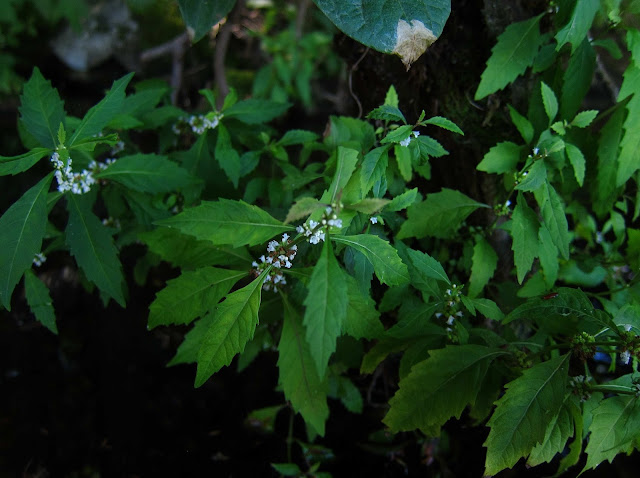 This Marchantia polymorpha is one of the few liverworts I can recognize on my own, especially when fruiting with those tiny umbrella-shaped fruits, but both Nancy and I were surprised to find it growing out on these islands. It's usually found covering the soil in potted plants, much to the dismay of nurserymen.