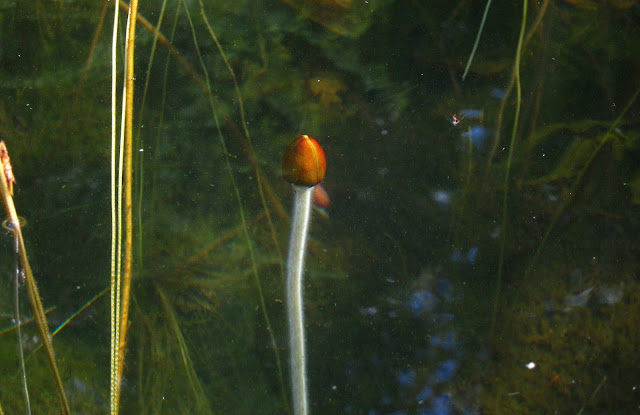 I had never seen a Water Lily bud rising from the lake bottom and making a bee-line for the surface. The sunlight picked out its white stem and ruddy bud, making it easy to see below the water.