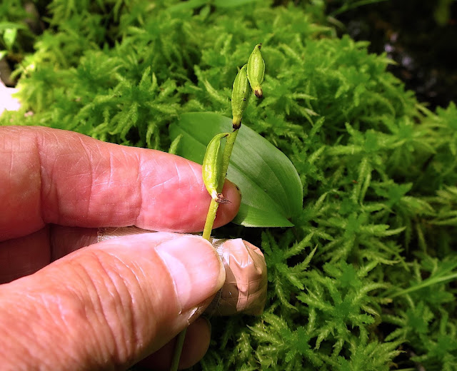 When we came to where our powerline ended atSpier Falls Road, I urged my friends to cross the road and walk a ways on another stretch along the line. We will see Greenish-flowered Pyrolas (Pyrola chlorantha) down there, I promised. And so we did. The ones we found were well past their prime, but I had taken this photo last week, and we did find a few that looked almost like this.