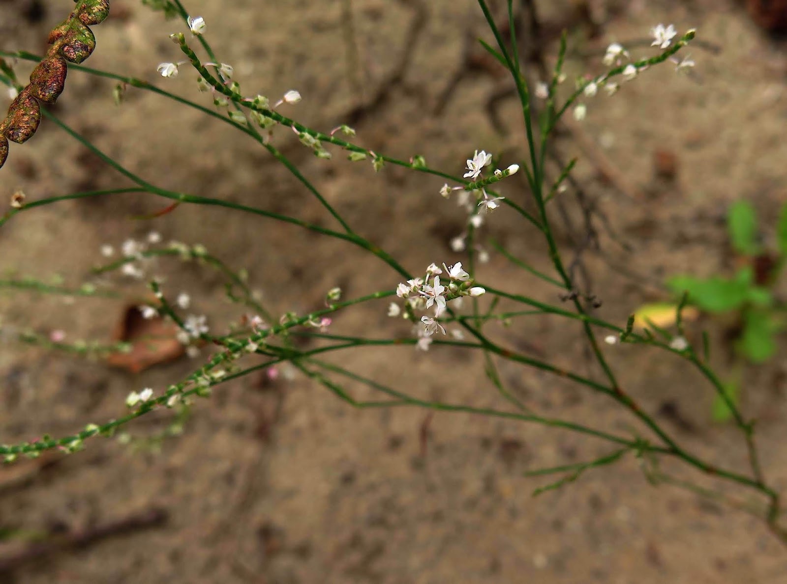 Fall is the best time of year to find those flowers that prefer dry sand, such as this delicate-looking Sand Jointweed (Polygonella articulata).  It truly abounds at Woods Hollow, but it's quite possible to walk past it without noticing it, for its spindly stems and tiny pale florets can disappear against the sandy background.